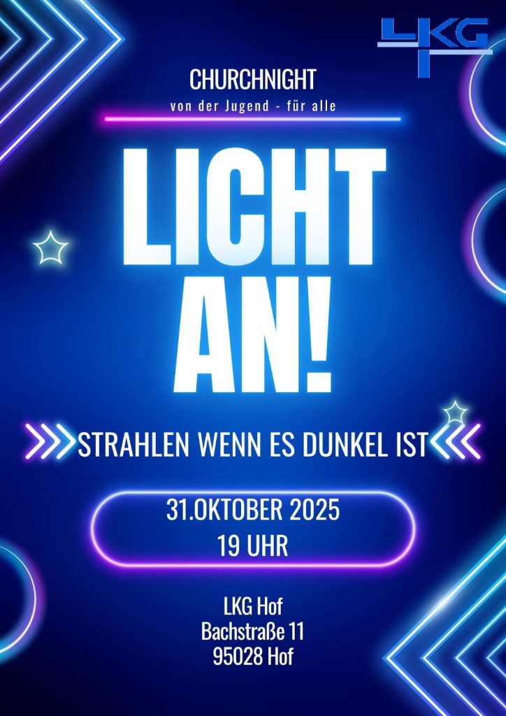 STARTSEITE Veranstaltungen in der Bachstraße Nachrichten aus dem Verband So. 12.10.2025 11.00 Uhr | P3-Gottesdienst in St. Johannes KircheSo. 19.10.2025 10.00 Uhr | Brunchtime mit Thomas ErhardtSo. 26.10.2025 18:00 Uhr | Predigt mit Christian SchwarzrockSo. 02.11.2025 10.30 Uhr | Predigt mit Philipp MauerSo. 09.11.2025 18.00 Uhr | Predigt mit Christian Schwarzrock (Abendmahl)So. 16.11.2025 10:00 Uhr | Brunchtime mit Christian SchwarzrockSo. 23.11.2025 18.00 Uhr | Predigt mit Rüdiger LaßSo. 30.11.2025 18.00 Uhr | Predigt mit Thomas Erhardt Gemeinschaftsbrief Gemeinschaftsbrief Oktober / NovemberVerbandszeitschrift BlickpunktGnadauer Gemeinschaftsverband Sonstiges Freizeiten des CFRCrossing – ein Jahr für GottVorschau für Termine in den nächsten Wochen :LKG Mitgliederversammlung Bayern e.V.: Sa. 15.11. 10:00 Uhr in der LKG KulmbachGemeindegebet jeweils 18:45 Uhr: 02.10., 16.10., 30.10., 13.11., 27.11.